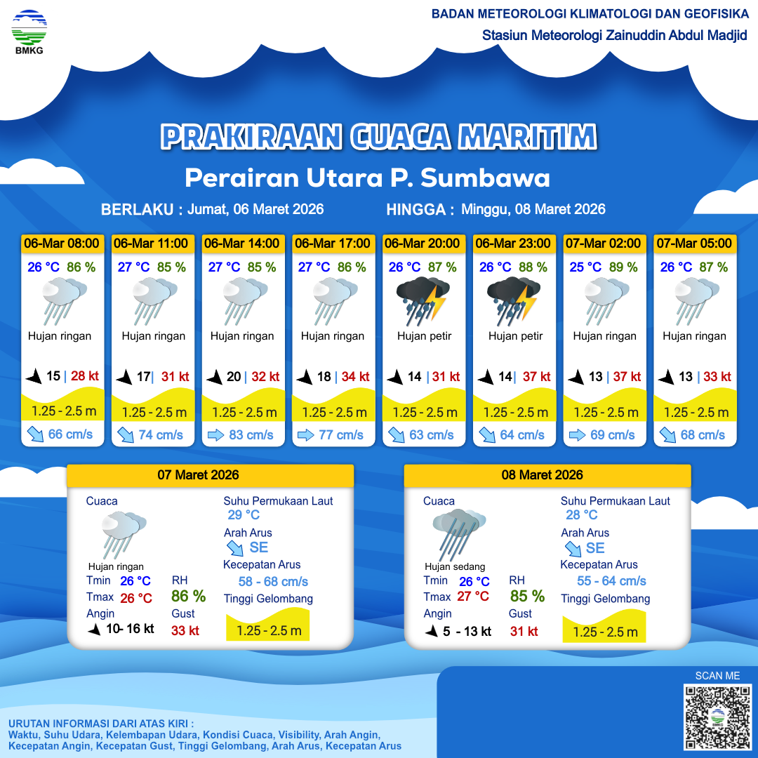 6 Mar 26, 08.00 10 jam kedepan | Barat Laut 18 kt Gust Peningkatan kecepatan angin yang singkat dan tiba-tiba : 38 kt | 2 m Sedang | Timur 81.0 cm/s | 27 °C | 85 % | |