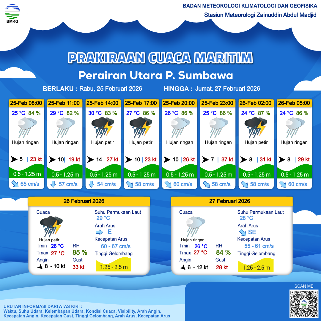 25 Feb 26, 23.00 7 jam kedepan | Barat Laut 8 kt Gust Peningkatan kecepatan angin yang singkat dan tiba-tiba : 31 kt | 1.1 m Rendah | Tenggara 63.0 cm/s | 25 °C | 85 % |