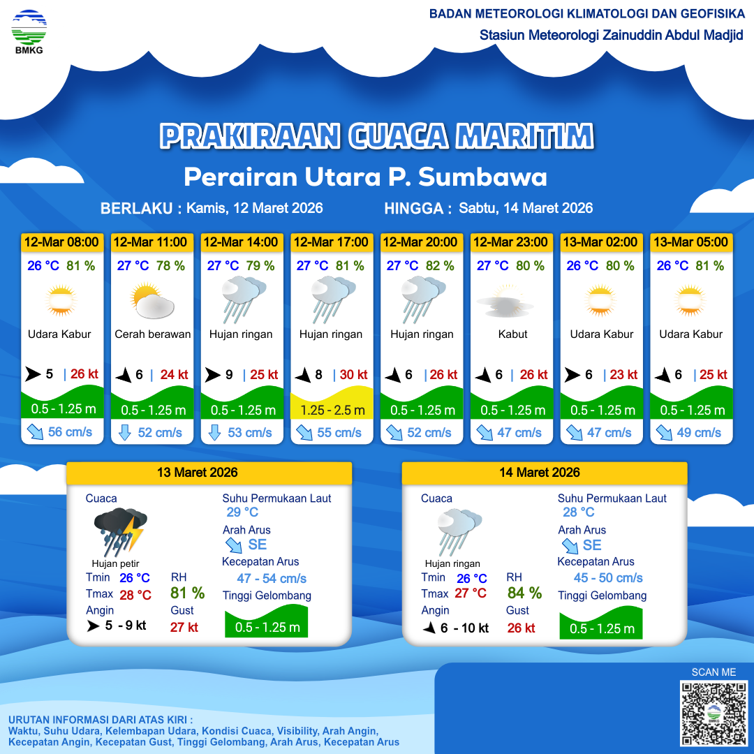 12 Mar 26, 13.00 14 jam kedepan | Barat Laut 6 kt Gust Peningkatan kecepatan angin yang singkat dan tiba-tiba : 25 kt | 1.1 m Rendah | Tenggara 51.0 cm/s | 27 °C | 81 % | |