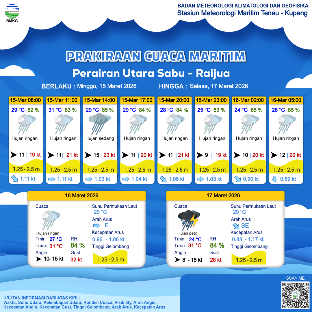 15 Mar 26, 15.00 2 jam kedepan | Barat 9 kt Gust Peningkatan kecepatan angin yang singkat dan tiba-tiba : 19 kt | 1.9 m Sedang | Timur 1.0 knot | 25 °C | 83 % | |