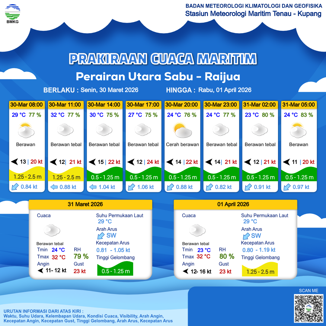 30 Mar 26, 18.00 3 jam kedepan | Timur 12 kt Gust Peningkatan kecepatan angin yang singkat dan tiba-tiba : 21 kt | 1.2 m Rendah | Barat Daya 0.9 Knots | 23 °C | 80 % | |