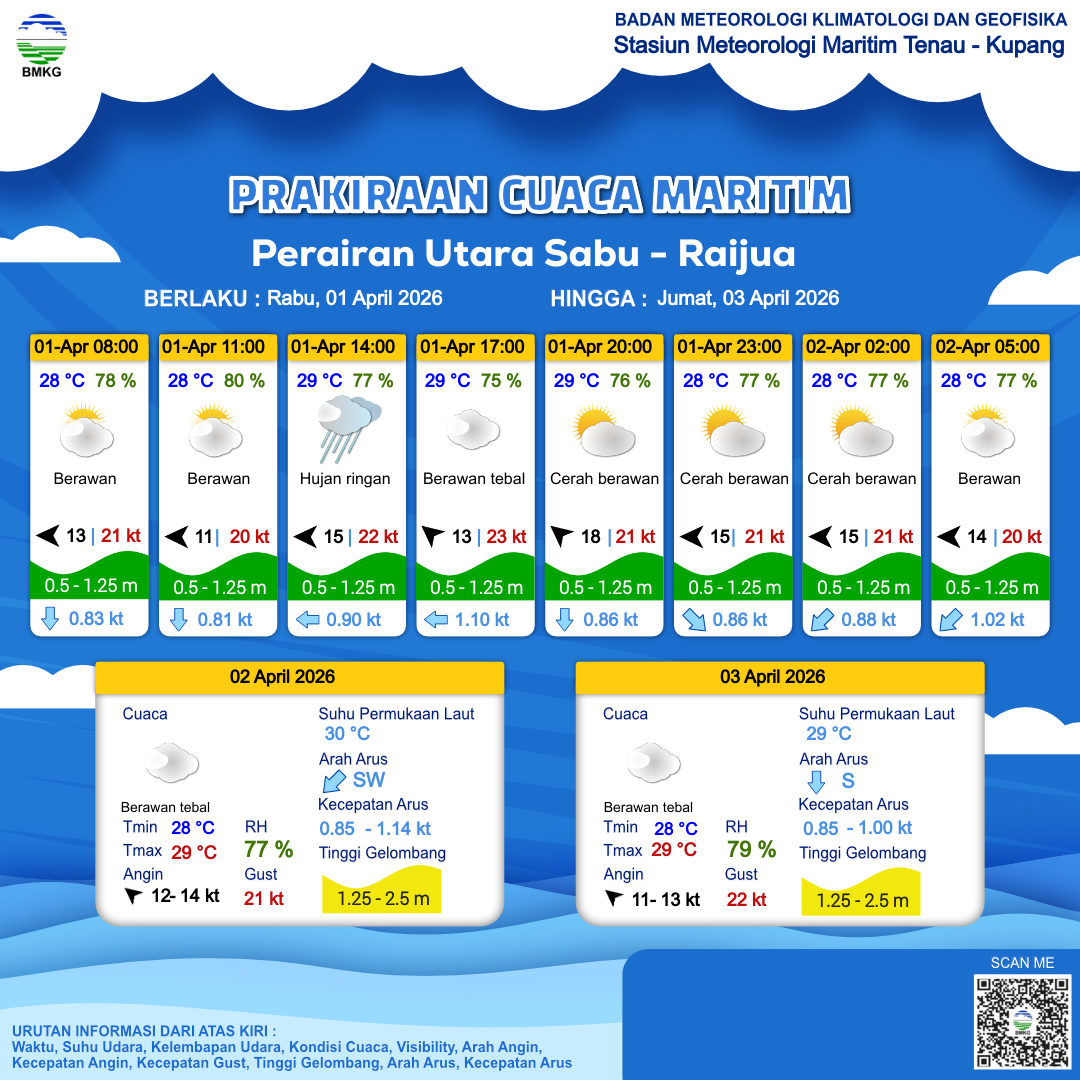 31 Mar 26, 20.00 14 jam kedepan | Timur 12 kt Gust Peningkatan kecepatan angin yang singkat dan tiba-tiba : 21 kt | 1.1 m Rendah | Barat Daya 0.9 Knots | 25 °C | 80 % | |