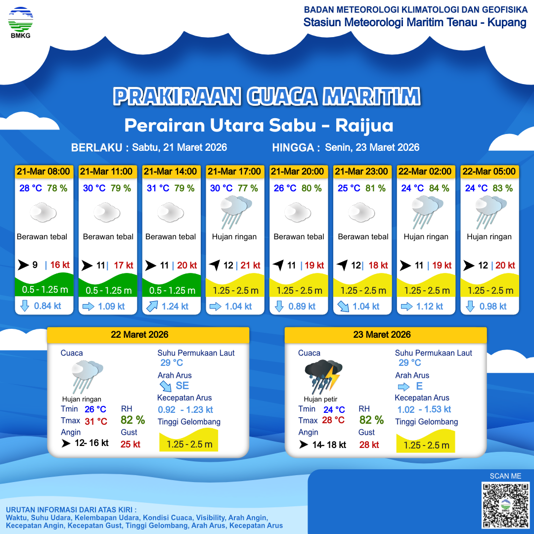 21 Mar 26, 21.00 3 jam kedepan | Barat 12 kt Gust Peningkatan kecepatan angin yang singkat dan tiba-tiba : 20 kt | 1.4 m Sedang | Selatan 1.0 Knots | 24 °C | 83 % | |
