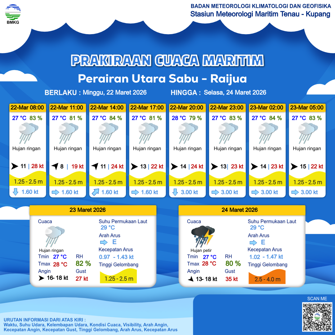 22 Mar 26, 12.00 3 jam kedepan | Barat 14 kt Gust Peningkatan kecepatan angin yang singkat dan tiba-tiba : 24 kt | 2 m Sedang | Selatan 3.0 Knots | 28 °C | 79 % | |