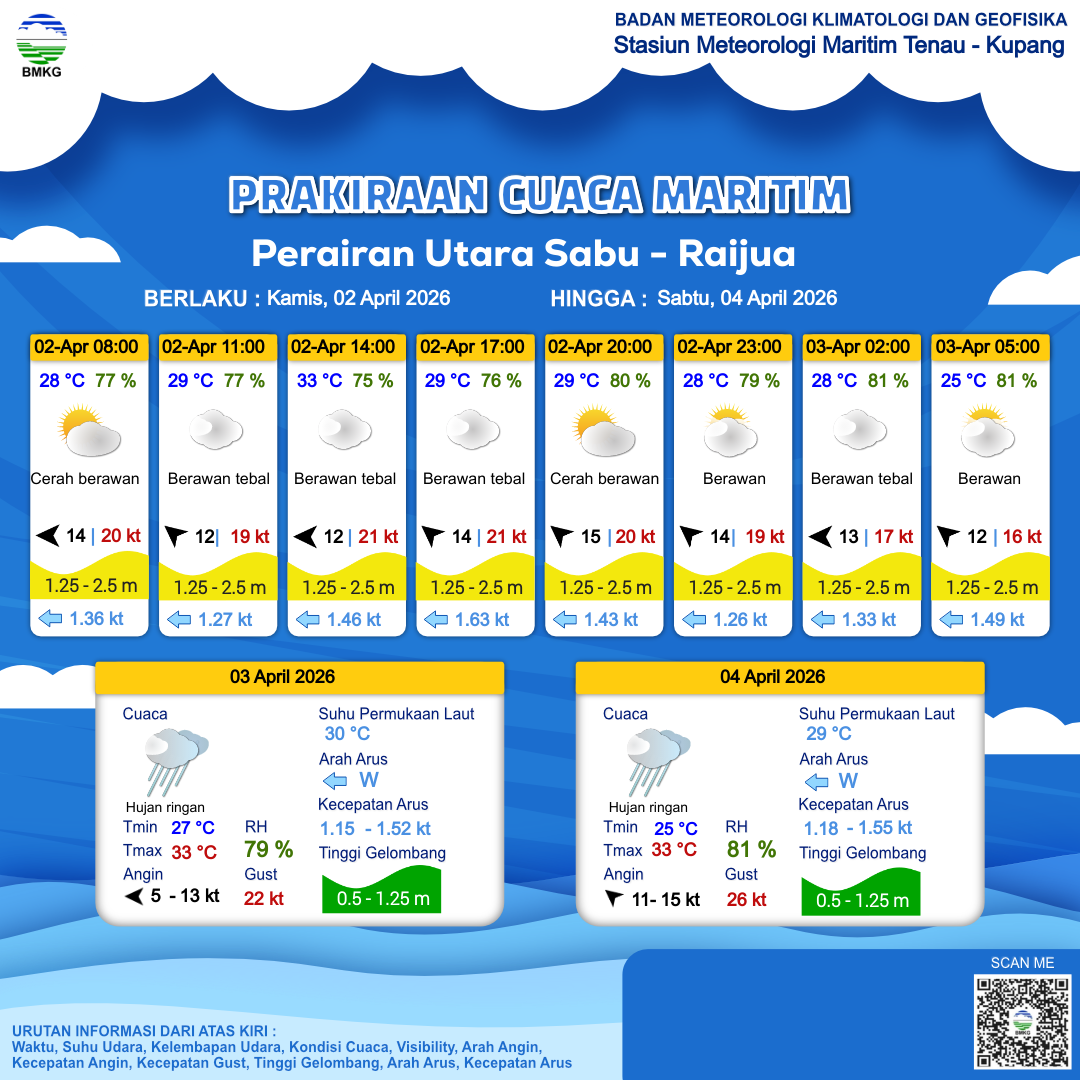 1 Apr 26, 23.00 2 jam kedepan | Berawan | Tenggara 14 kt Gust Peningkatan kecepatan angin yang singkat dan tiba-tiba : 20 kt | | | 28 °C | 76 % |