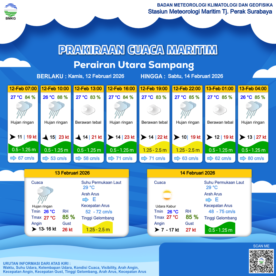 12 Feb 26, 14.00 4 jam kedepan | Barat 10 kt Gust Peningkatan kecepatan angin yang singkat dan tiba-tiba : 24 kt | 1.6 m Sedang | Timur 70.0 cm/s | 27 °C | 86 % | |