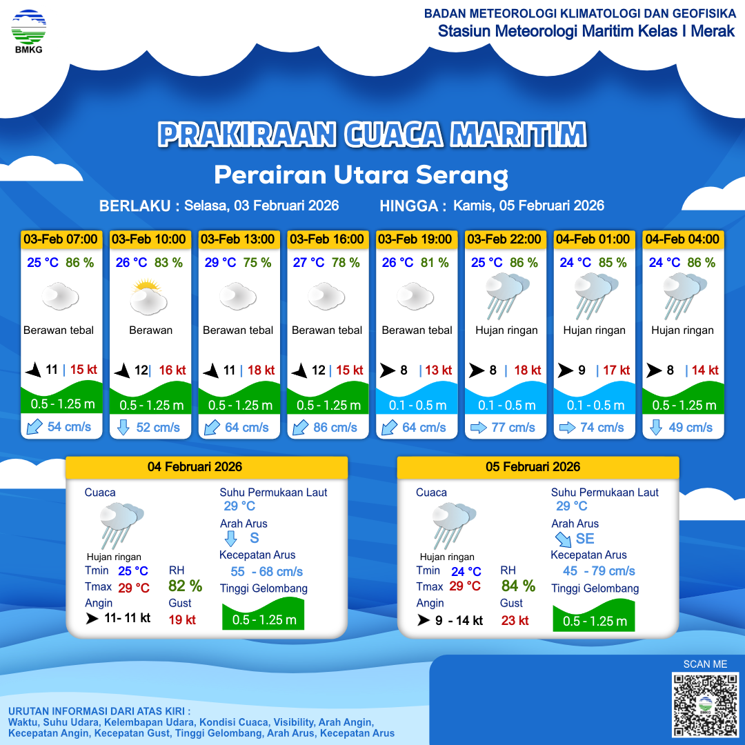 2 Feb 26, 23.00 2 jam kedepan | Hujan Ringan | Barat Laut 8 kt Gust Peningkatan kecepatan angin yang singkat dan tiba-tiba : 17 kt | | | 25 °C | 86 % |