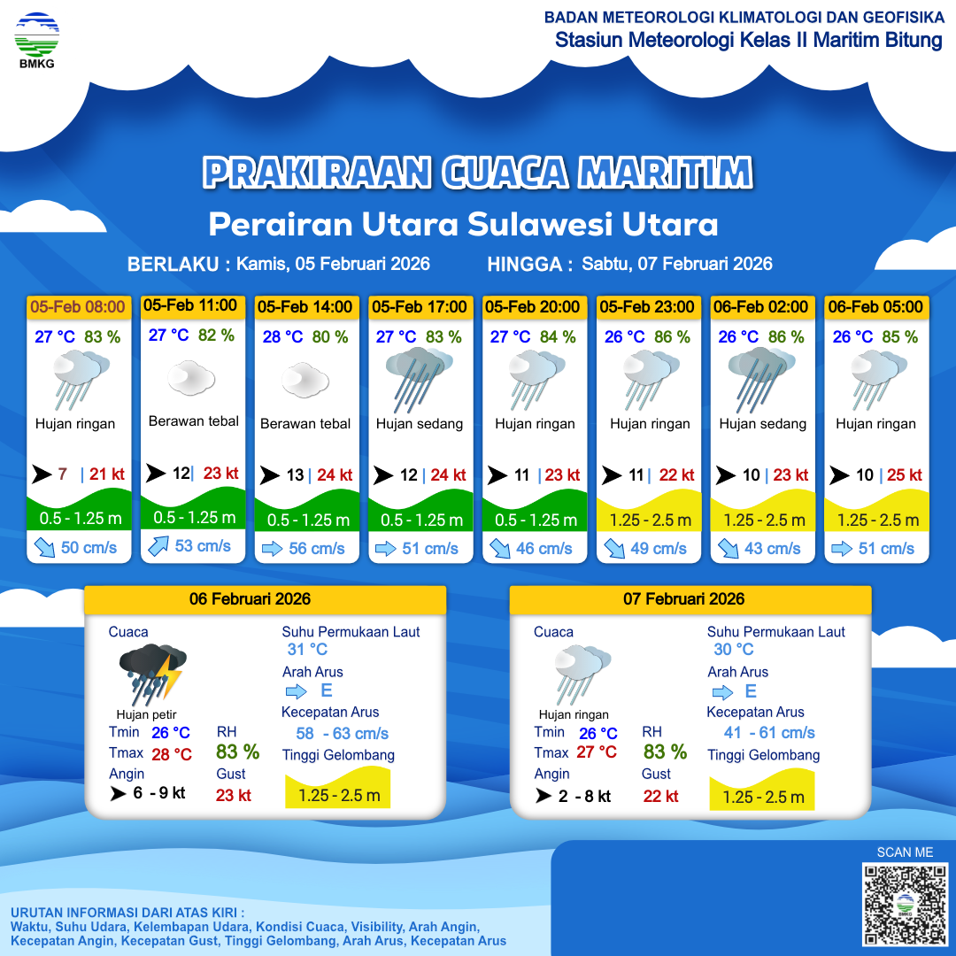5 Feb 26, 04.00 3 jam kedepan | Barat 12 kt Gust Peningkatan kecepatan angin yang singkat dan tiba-tiba : 24 kt | 0.9 m Rendah | Timur Laut 56.0 cm/s | 28 °C | 80 % | |