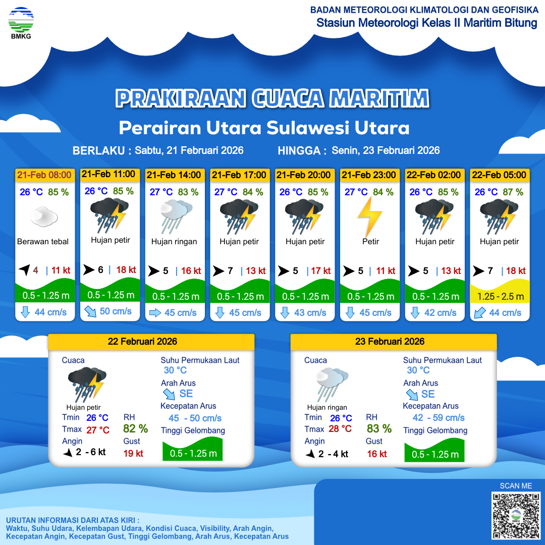 21 Feb 26, 03.00 2 jam kedepan | Barat 6 kt Gust Peningkatan kecepatan angin yang singkat dan tiba-tiba : 18 kt | 0.9 m Rendah | Tenggara 50.0 cm/s | 26 °C | 85 % | |