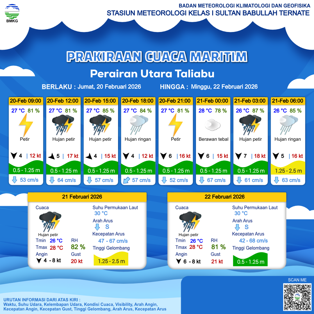 20 Feb 26, 22.00 16 jam kedepan | Utara 5 kt Gust Peningkatan kecepatan angin yang singkat dan tiba-tiba : 14 kt | 1.4 m Sedang | Selatan 55.0 cm/s | 27 °C | 83 % | |