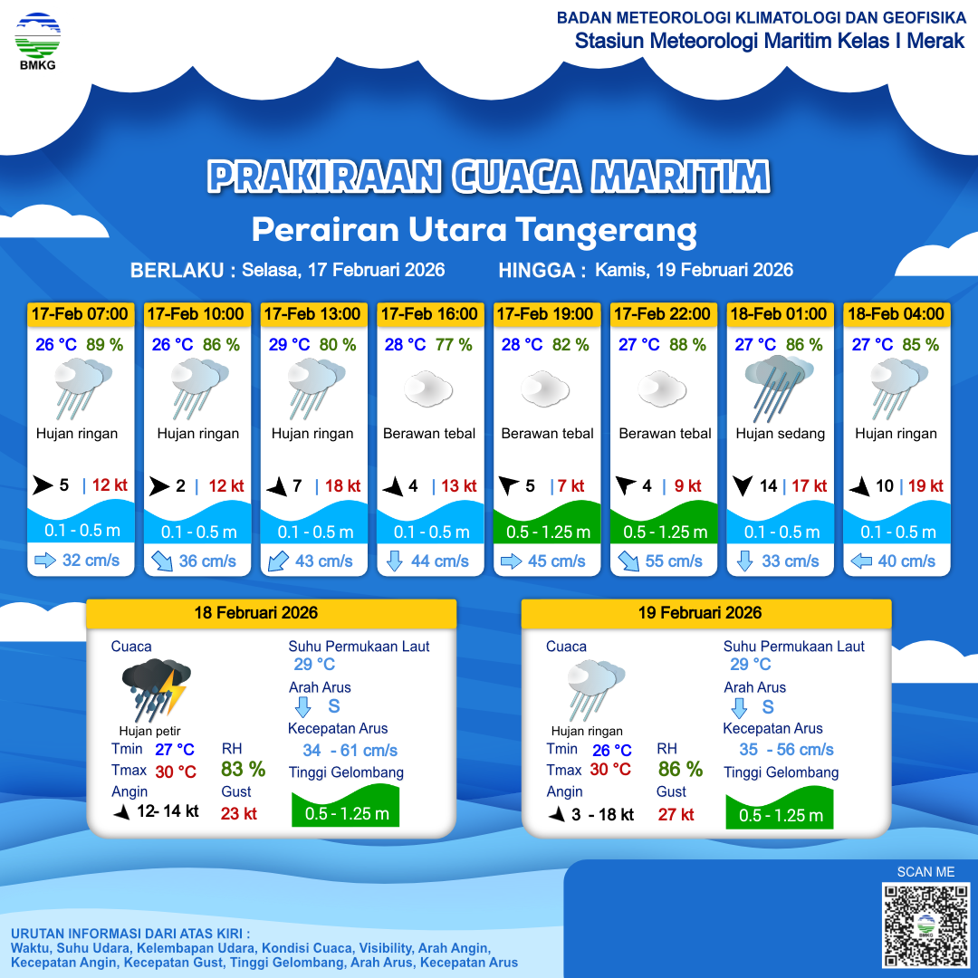 16 Feb 26, 23.00 2 jam kedepan | Hujan Ringan | Barat 6 kt Gust Peningkatan kecepatan angin yang singkat dan tiba-tiba : 13 kt | | | 25 °C | 90 % |