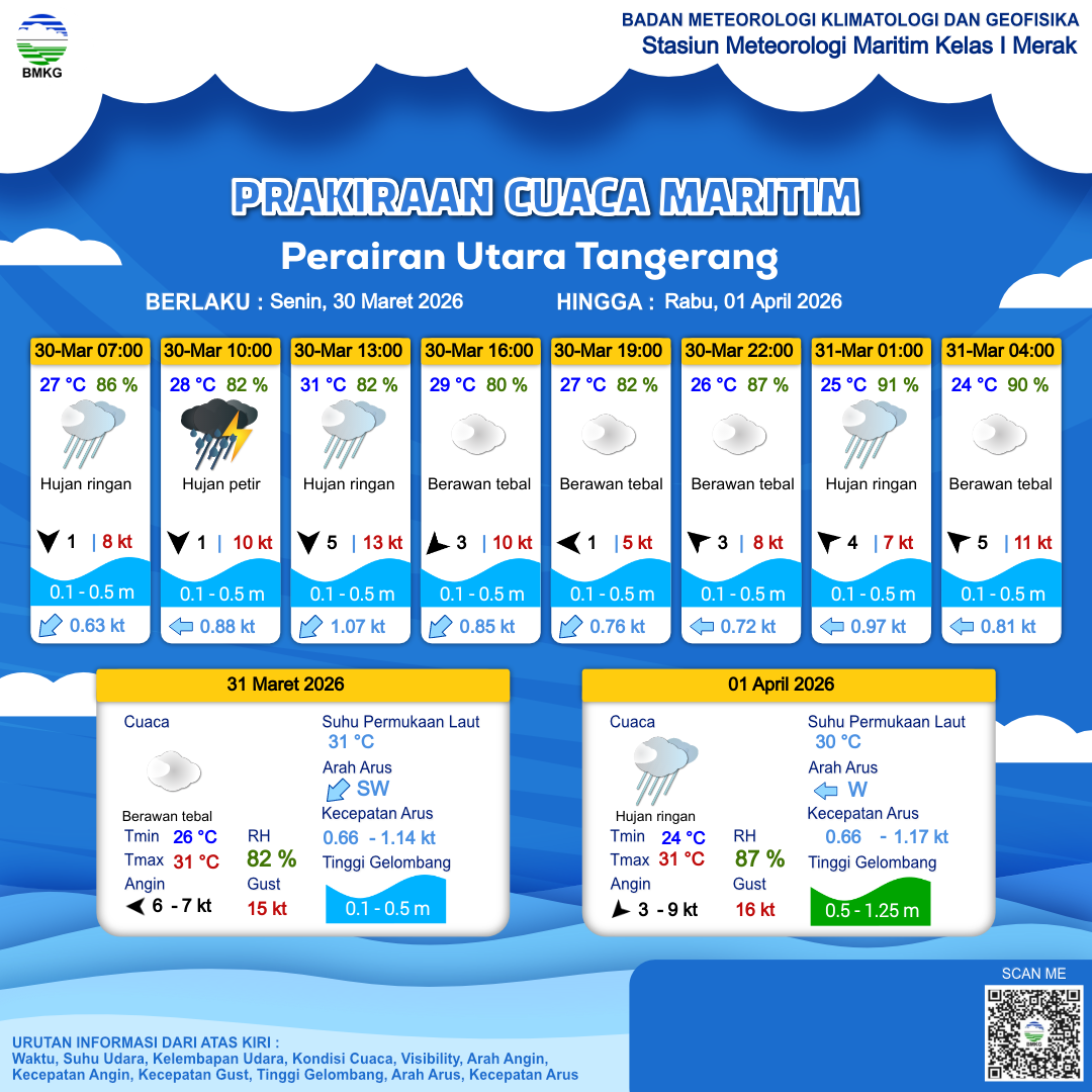 30 Mar 26, 23.00 11 jam kedepan | Tenggara 6 kt Gust Peningkatan kecepatan angin yang singkat dan tiba-tiba : 11 kt | 0.1 m Tenang | Selatan 0.7 Knots | 25 °C | 92 % |