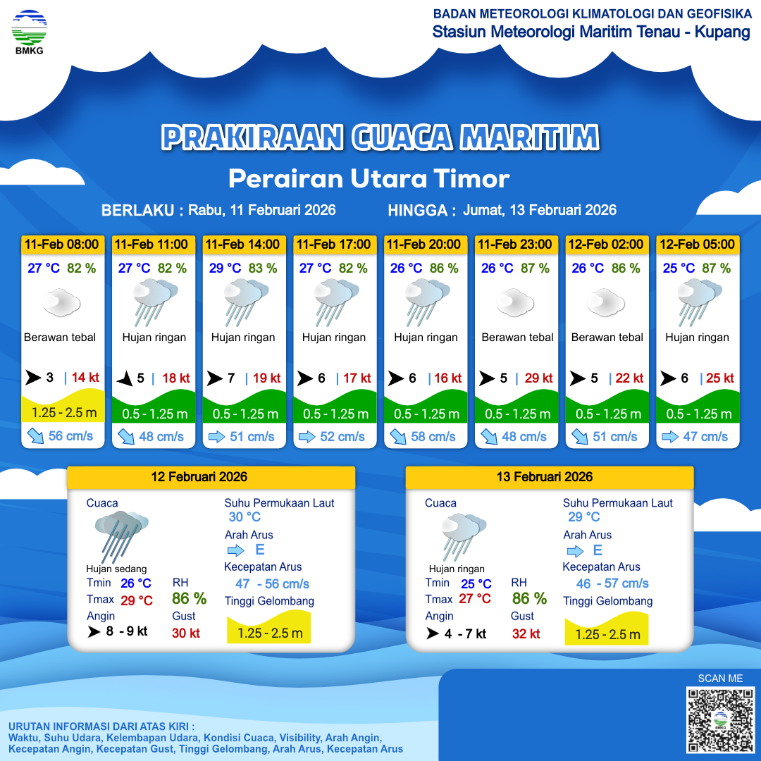 11 Feb 26, 13.00 2 jam kedepan | Barat 6 kt Gust Peningkatan kecepatan angin yang singkat dan tiba-tiba : 30 kt | 1.1 m Rendah | Tenggara 56.0 cm/s | 26 °C | 86 % | |