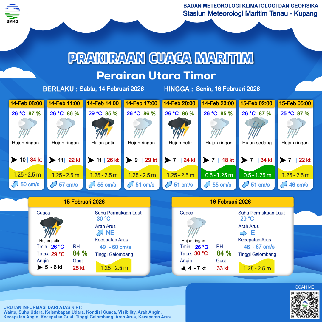 14 Feb 26, 15.00 4 jam kedepan | Barat 7 kt Gust Peningkatan kecepatan angin yang singkat dan tiba-tiba : 18 kt | 1.2 m Rendah | Timur Laut 55.0 cm/s | 26 °C | 85 % | |