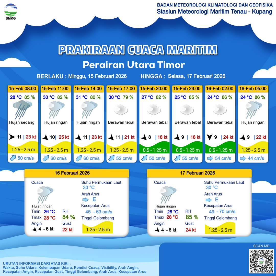 15 Feb 26, 15.00 3 jam kedepan | Barat Laut 9 kt Gust Peningkatan kecepatan angin yang singkat dan tiba-tiba : 18 kt | 1.1 m Rendah | Timur Laut 55.0 cm/s | 25 °C | 85 % | |