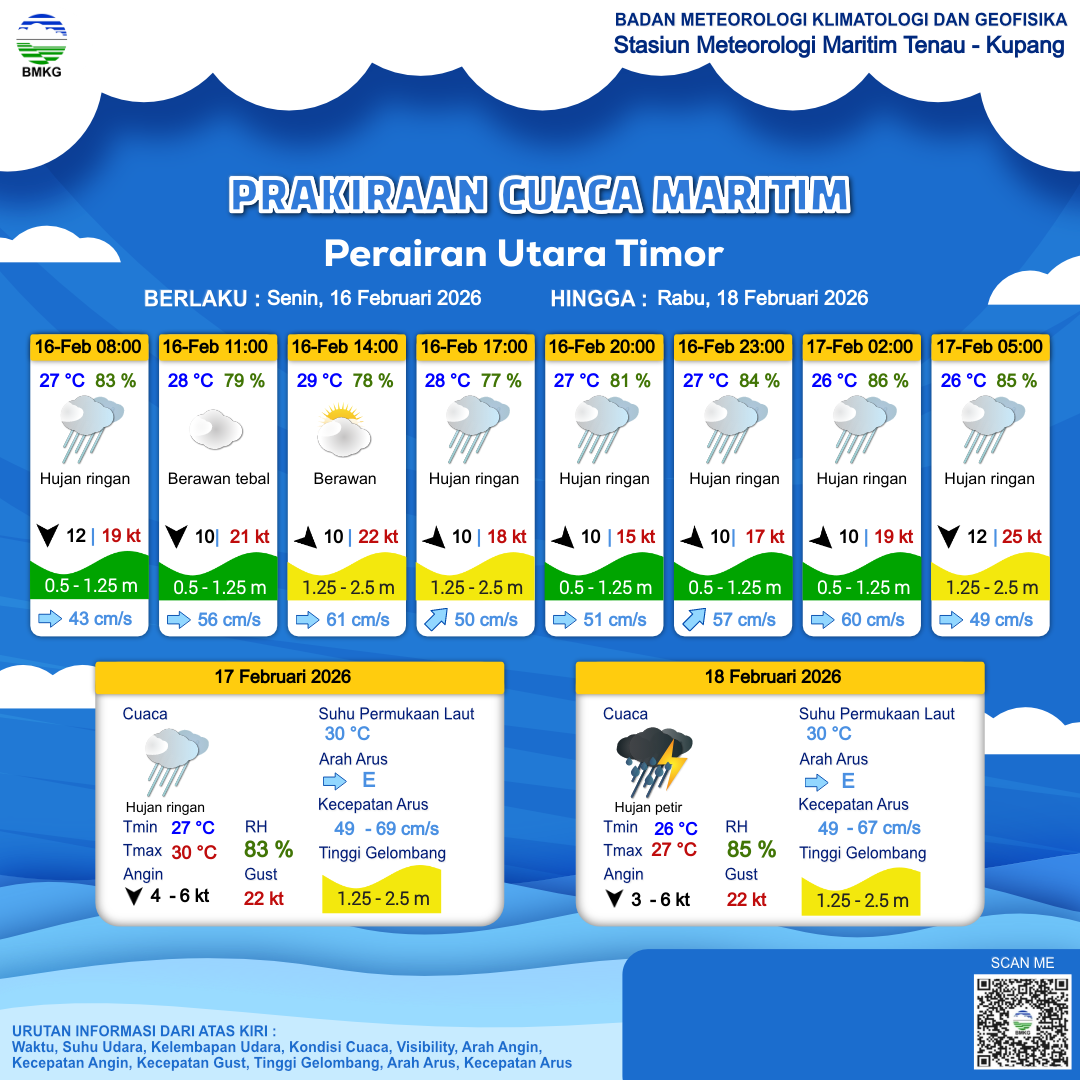 16 Feb 26, 02.00 2 jam kedepan | Utara 12 kt Gust Peningkatan kecepatan angin yang singkat dan tiba-tiba : 20 kt | 1.2 m Rendah | Timur 51.0 cm/s | 27 °C | 80 % | |
