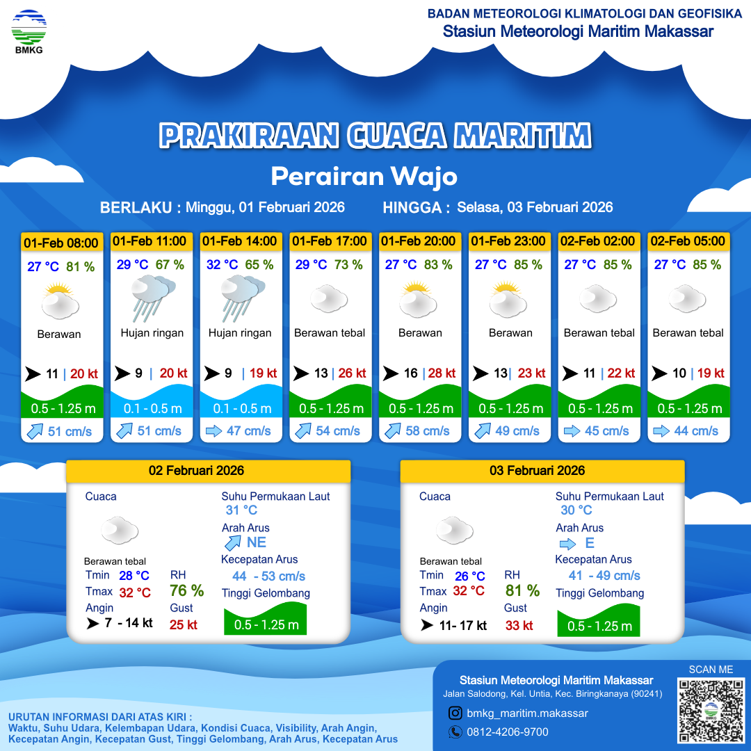1 Feb 26, 11.00 5 jam kedepan | Barat 16 kt Gust Peningkatan kecepatan angin yang singkat dan tiba-tiba : 27 kt | 0.8 m Rendah | Timur Laut 59.0 cm/s | 28 °C | 79 % | |