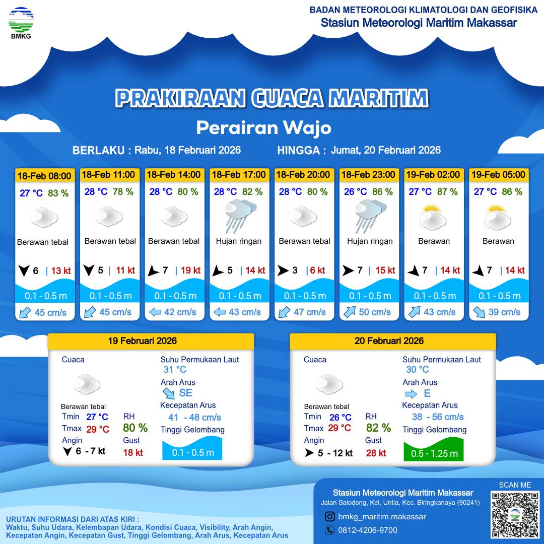 18 Feb 26, 12.00 4 jam kedepan | Barat 3 kt Gust Peningkatan kecepatan angin yang singkat dan tiba-tiba : 6 kt | 0.4 m Tenang | Timur 47.0 cm/s | 28 °C | 80 % | |