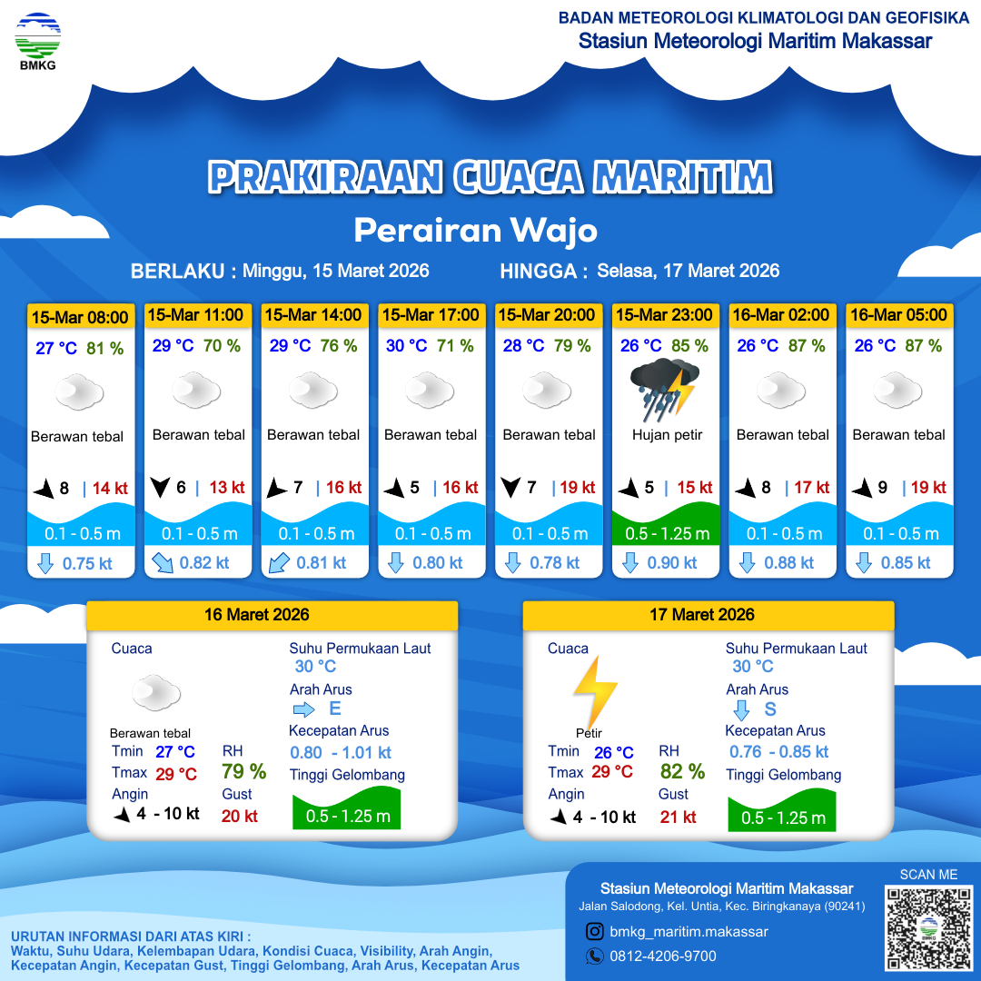 15 Mar 26, 12.00 2 jam kedepan | Utara 7 kt Gust Peningkatan kecepatan angin yang singkat dan tiba-tiba : 19 kt | 0.2 m Tenang | Selatan 0.8 knot | 28 °C | 79 % | |