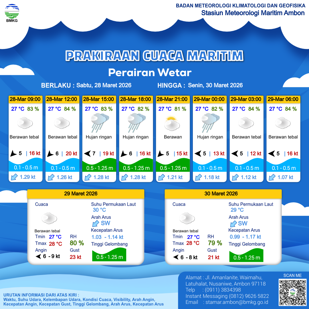 28 Mar 26, 05.00 3 jam kedepan | Timur 7 kt Gust Peningkatan kecepatan angin yang singkat dan tiba-tiba : 19 kt | 0.5 m Rendah | Barat Daya 1.3 Knots | 27 °C | 84 % | |