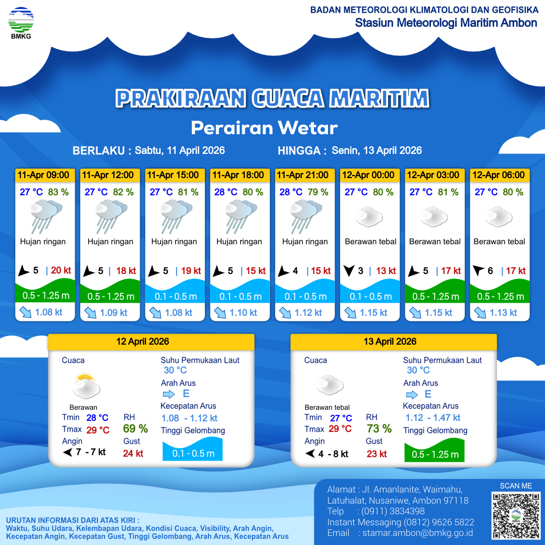11 Apr 26, 22.00 24 jam kedepan | Tenggara 6 kt Gust Peningkatan kecepatan angin yang singkat dan tiba-tiba : 18 kt | 0.6 m Rendah | Tenggara 1.1 Knots | 27 °C | 80 % | |