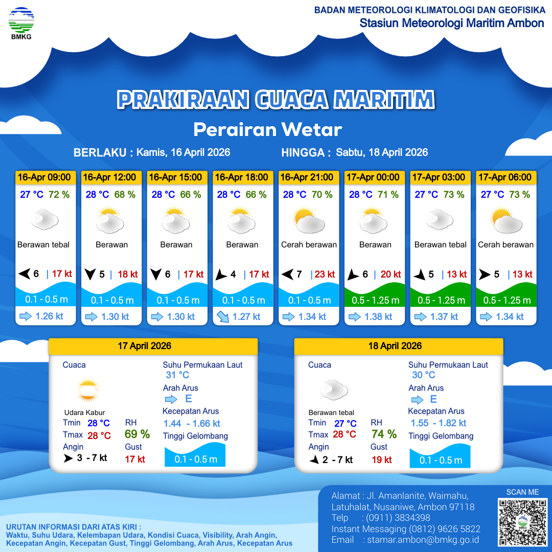 16 Apr 26, 11.00 8 jam kedepan | Timur 7 kt Gust Peningkatan kecepatan angin yang singkat dan tiba-tiba : 17 kt | 0.5 m Rendah | Timur 1.3 Knots | 28 °C | 68 % | |