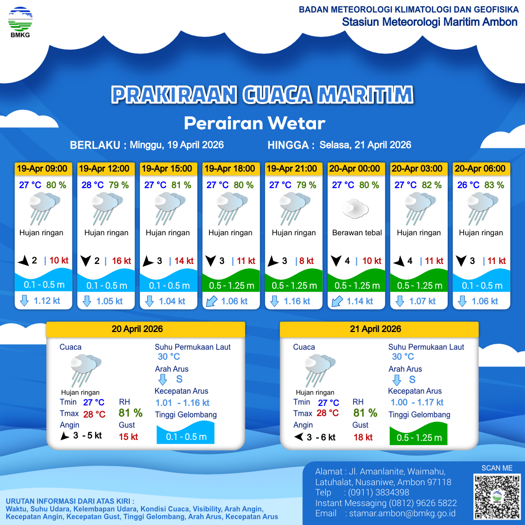 19 Apr 26, 22.00 6 jam kedepan | Utara 3 kt Gust Peningkatan kecepatan angin yang singkat dan tiba-tiba : 10 kt | 0.5 m Rendah | Selatan 1.1 Knots | 27 °C | 83 % | |