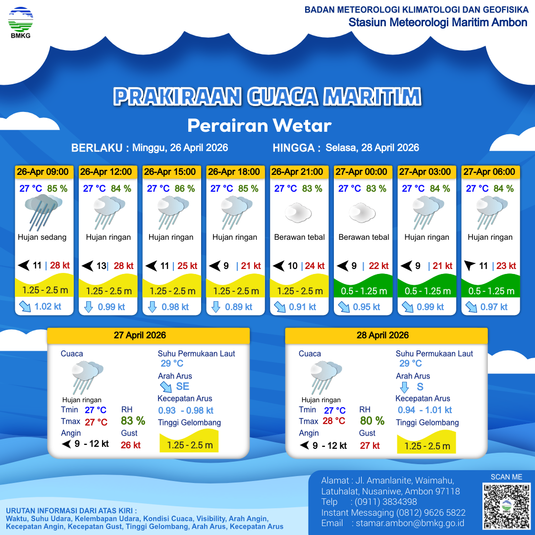 25 Apr 26, 23.00 2 jam kedepan | Hujan Ringan | Timur 11 kt Gust Peningkatan kecepatan angin yang singkat dan tiba-tiba : 30 kt | | | 26 °C | 85 % |