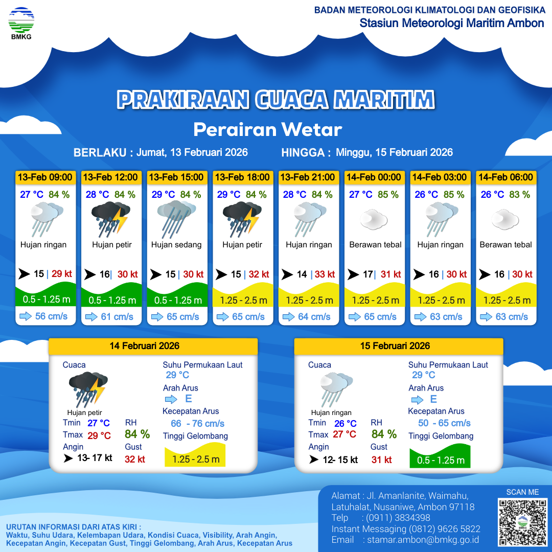 13 Feb 26, 17.00 2 jam kedepan | Barat 16 kt Gust Peningkatan kecepatan angin yang singkat dan tiba-tiba : 31 kt | 1.7 m Sedang | Timur 63.0 cm/s | 26 °C | 85 % | |