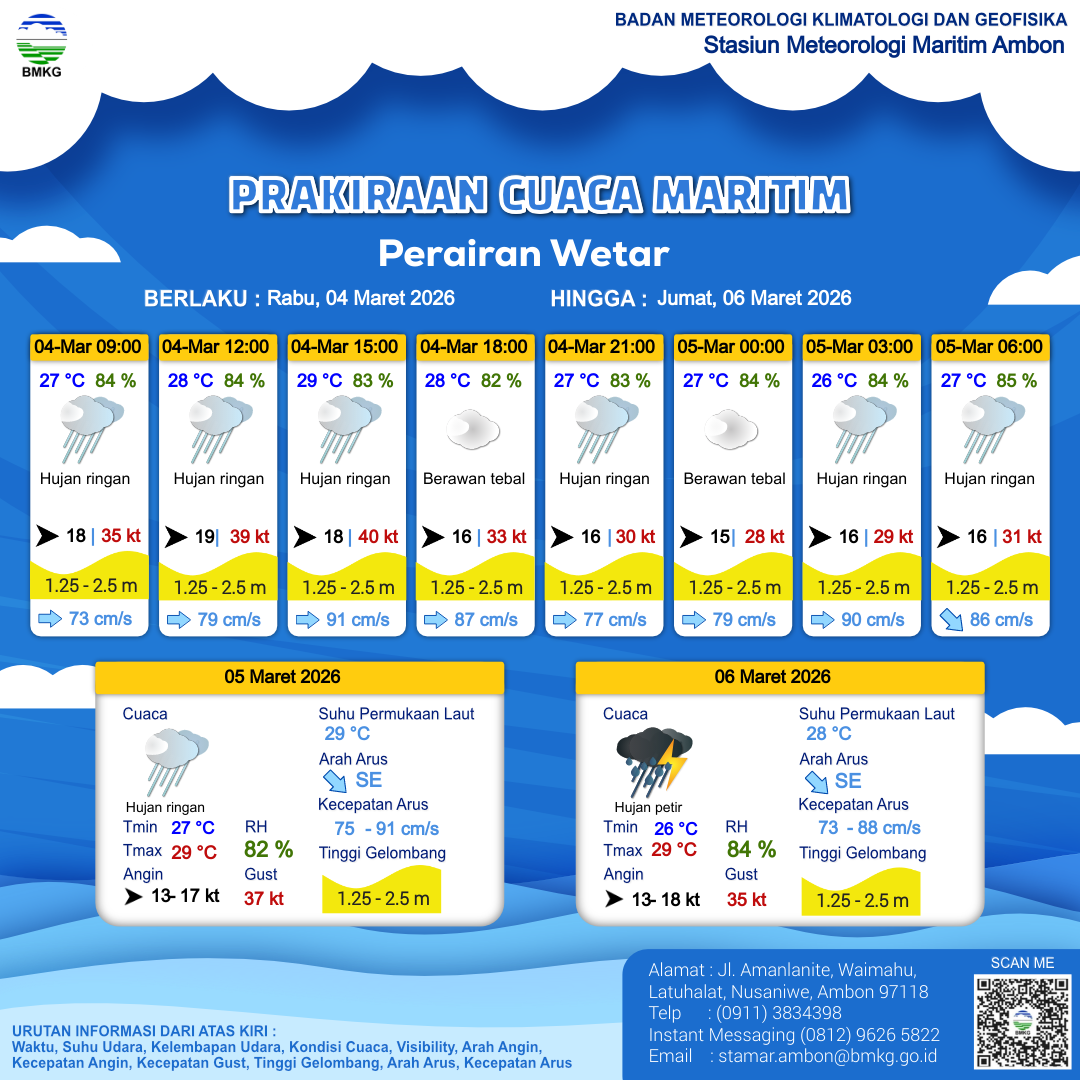3 Mar 26, 23.00 4 jam kedepan | Hujan Ringan | Barat 19 kt Gust Peningkatan kecepatan angin yang singkat dan tiba-tiba : 36 kt | | | 29 °C | 86 % |