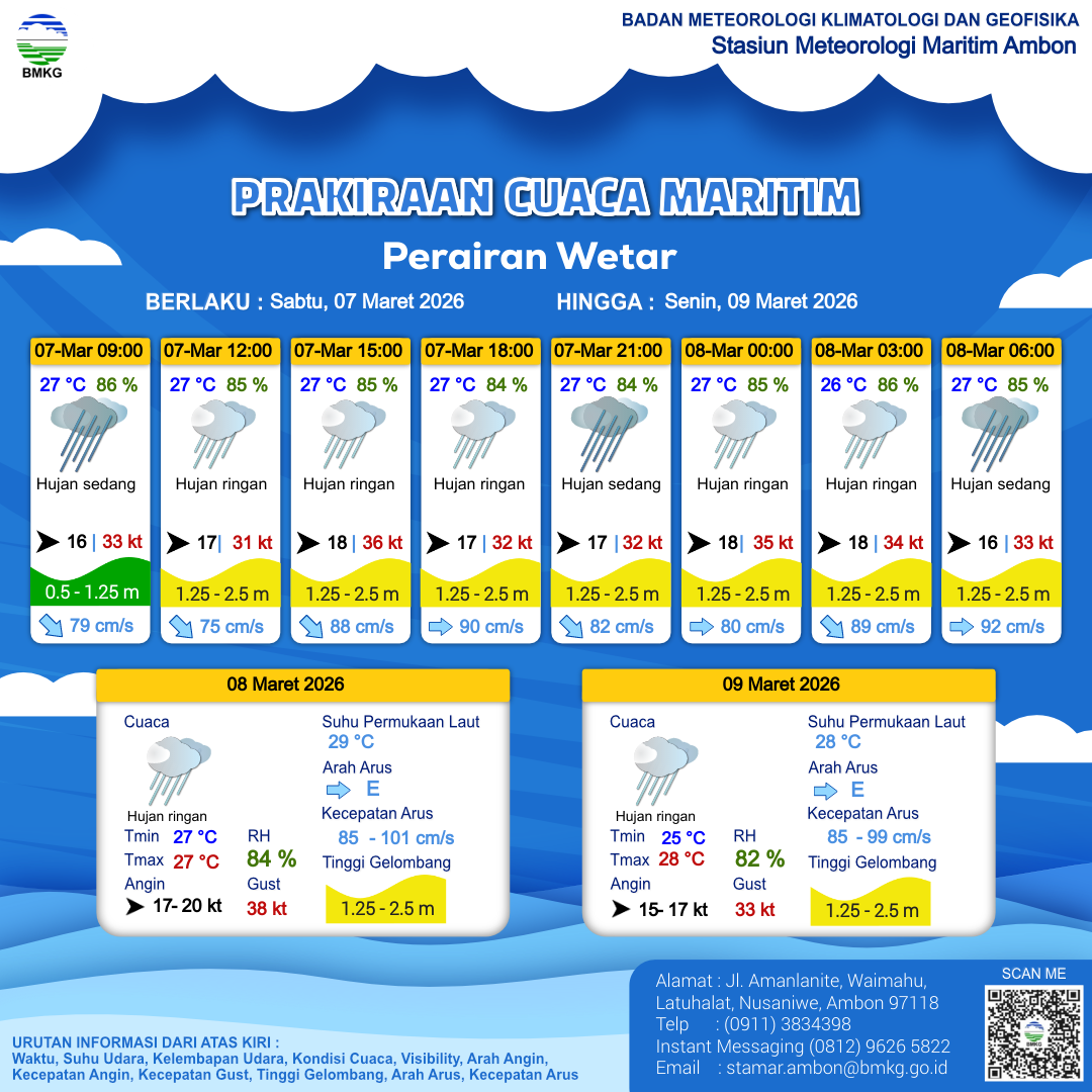 7 Mar 26, 09.00 9 jam kedepan | Barat 17 kt Gust Peningkatan kecepatan angin yang singkat dan tiba-tiba : 32 kt | 1.3 m Sedang | Timur 90.0 cm/s | 27 °C | 84 % | |