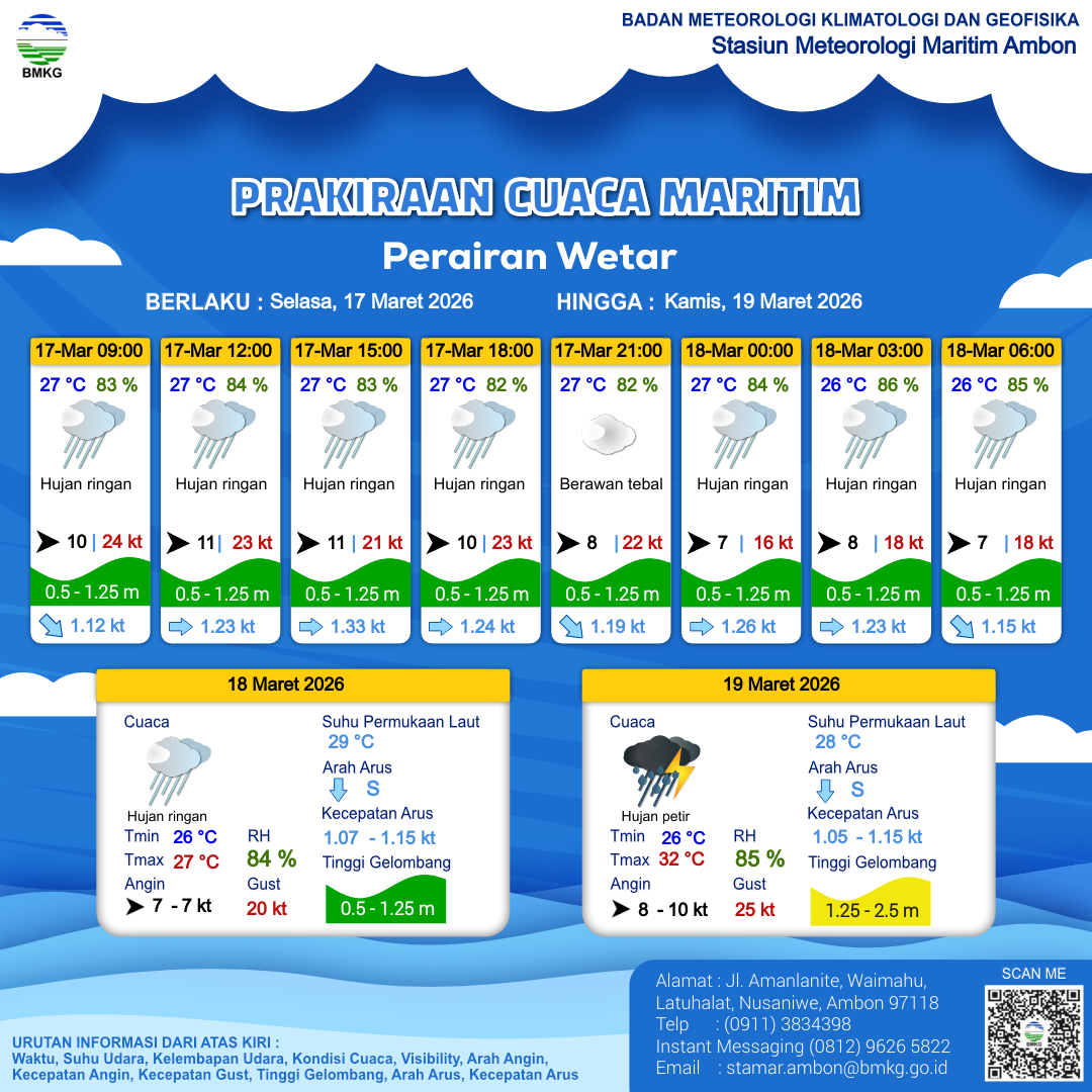 17 Mar 26, 06.00 5 jam kedepan | Barat 11 kt Gust Peningkatan kecepatan angin yang singkat dan tiba-tiba : 21 kt | 0.8 m Rendah | Timur 1.3 Knots | 27 °C | 83 % | |