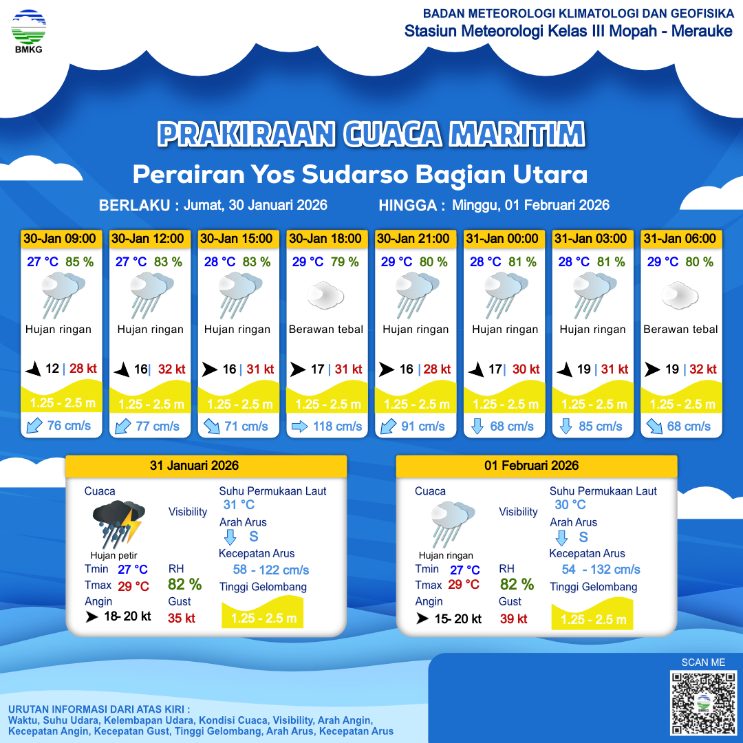 30 Jan 26, 22.00 12 jam kedepan | Barat 19 kt Gust Peningkatan kecepatan angin yang singkat dan tiba-tiba : 36 kt | 2.1 m Sedang | Selatan 59.0 cm/s | 28 °C | 80 % | |