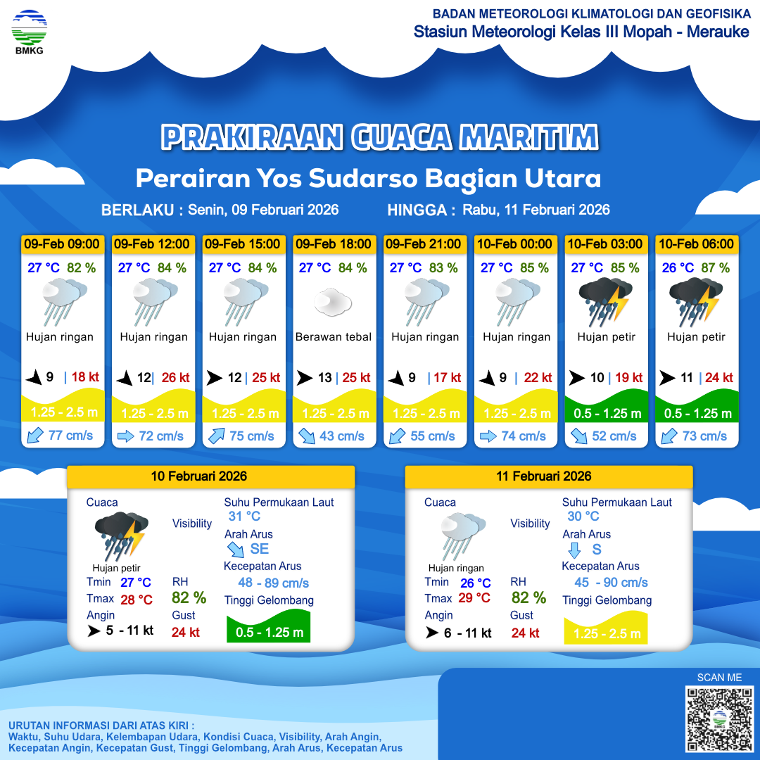 9 Feb 26, 17.00 2 jam kedepan | Barat 10 kt Gust Peningkatan kecepatan angin yang singkat dan tiba-tiba : 23 kt | 1.2 m Rendah | Timur 64.0 cm/s | 27 °C | 86 % | |