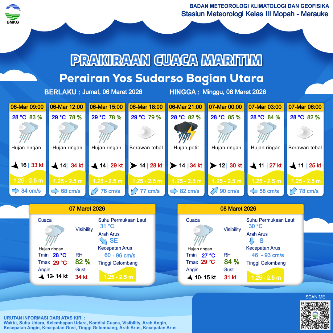 6 Mar 26, 10.00 4 jam kedepan | Barat 14 kt Gust Peningkatan kecepatan angin yang singkat dan tiba-tiba : 27 kt | 1.5 m Sedang | Selatan 70.0 cm/s | 29 °C | 78 % | |