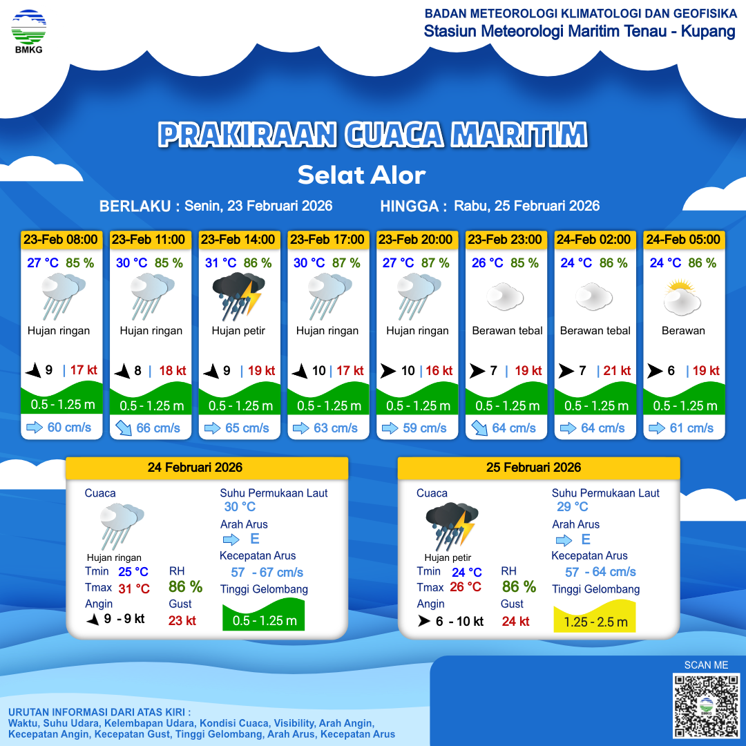 23 Feb 26, 22.00 17 jam kedepan | Barat 6 kt Gust Peningkatan kecepatan angin yang singkat dan tiba-tiba : 17 kt | 1.1 m Rendah | Timur 60.0 cm/s | 25 °C | 86 % | |