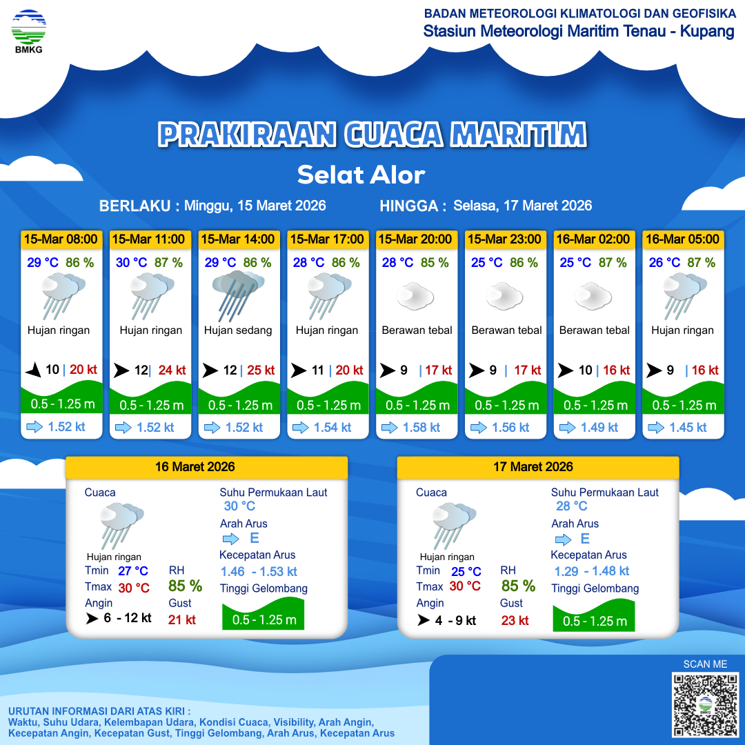 15 Mar 26, 22.00 3 jam kedepan | Hujan Ringan | Barat 9 kt Gust Peningkatan kecepatan angin yang singkat dan tiba-tiba : 17 kt | | | 27 °C | 86 % |