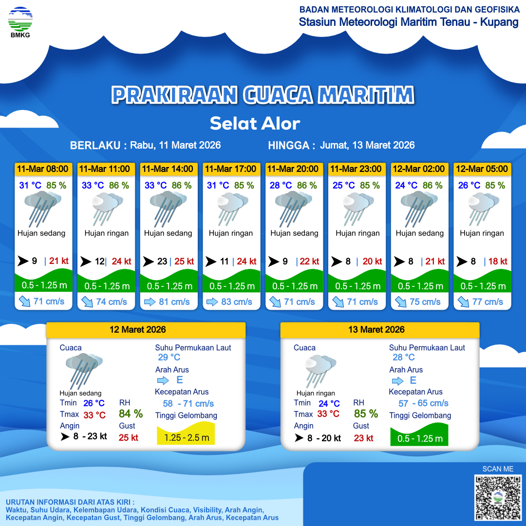 10 Mar 26, 23.00 4 jam kedepan | Hujan Ringan | Barat 10 kt Gust Peningkatan kecepatan angin yang singkat dan tiba-tiba : 22 kt | | | 26 °C | 86 % |