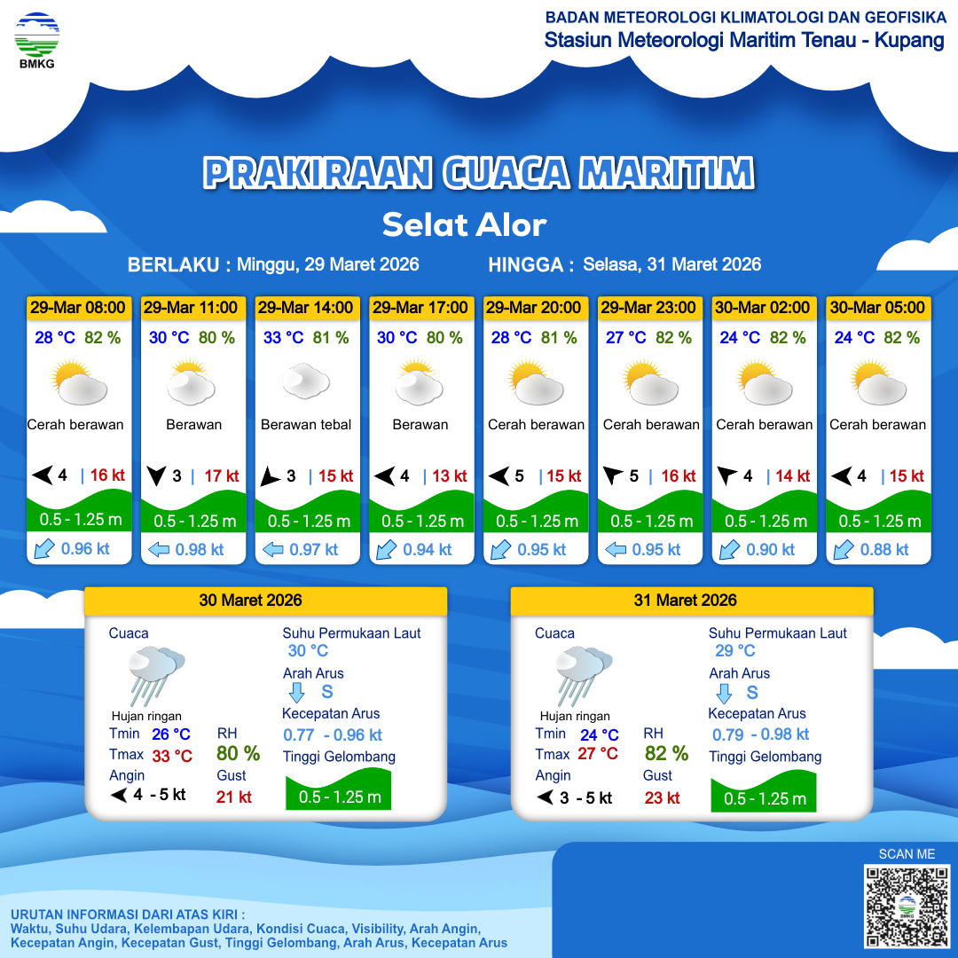 29 Mar 26, 14.00 2 jam kedepan | Tenggara 5 kt Gust Peningkatan kecepatan angin yang singkat dan tiba-tiba : 16 kt | 0.8 m Rendah | Barat 1.0 Knots | 27 °C | 81 % | |