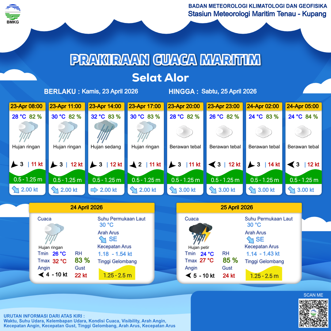 23 Apr 26, 08.00 24 jam kedepan | Barat Laut 2 kt Gust Peningkatan kecepatan angin yang singkat dan tiba-tiba : 9 kt | 1.2 m Rendah | Timur 2.0 Knots | 30 °C | 84 % | |