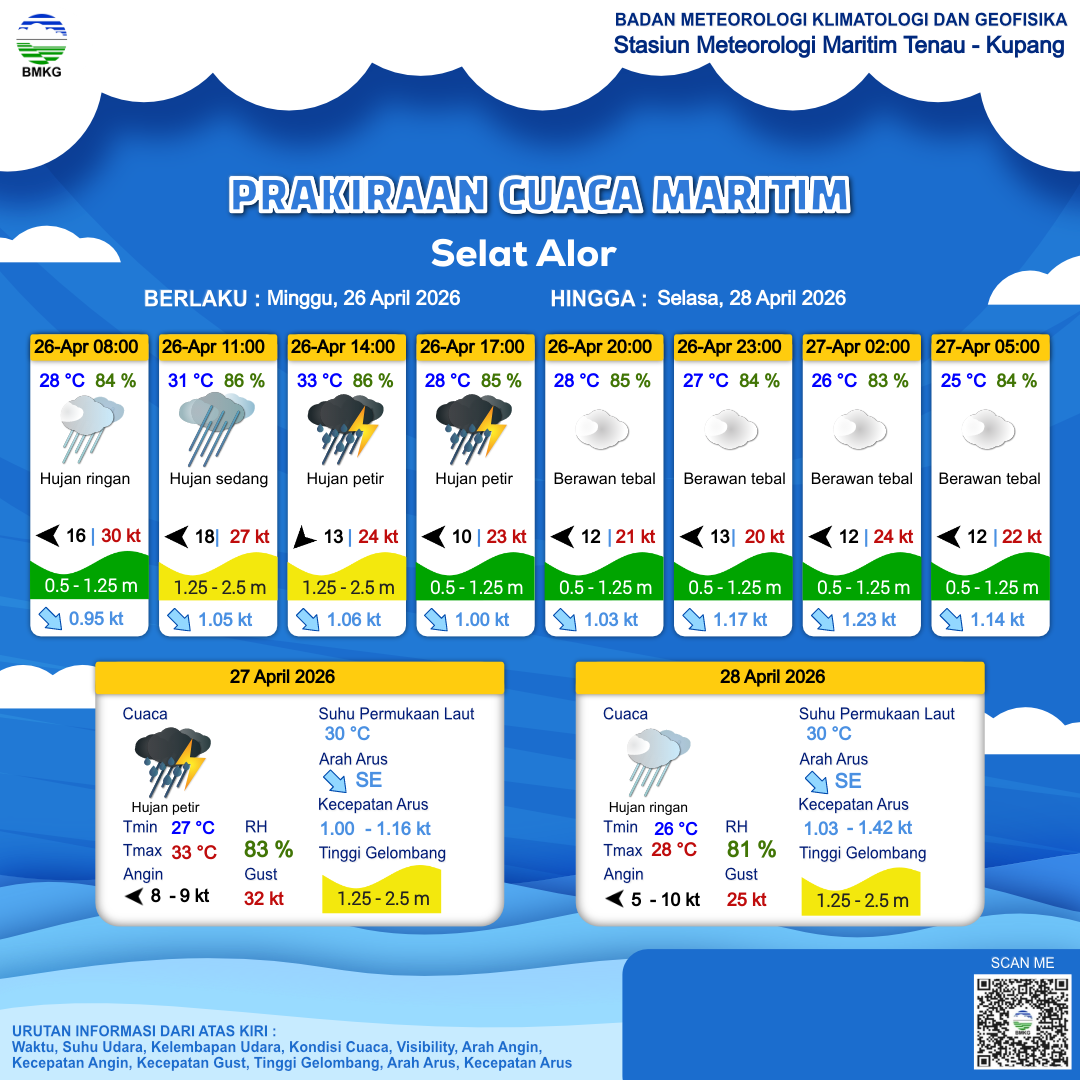 25 Apr 26, 23.00 5 jam kedepan | Timur 4 kt Gust Peningkatan kecepatan angin yang singkat dan tiba-tiba : 14 kt | 1.1 m Rendah | Tenggara 1.1 Knots | 25 °C | 86 % |