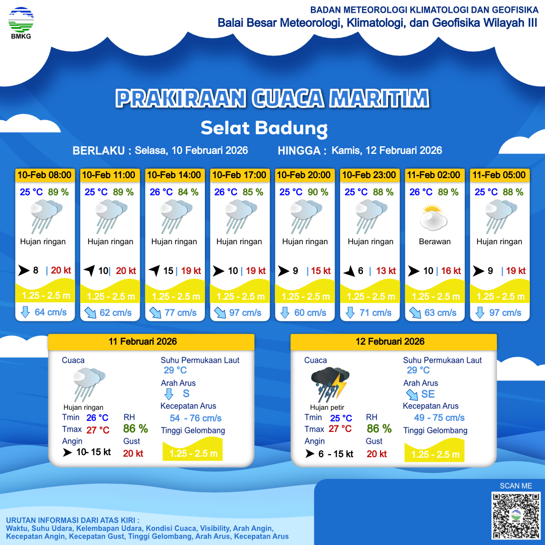 10 Feb 26, 03.00 2 jam kedepan | Barat Daya 10 kt Gust Peningkatan kecepatan angin yang singkat dan tiba-tiba : 20 kt | 2.5 m Tinggi | Tenggara 62.0 cm/s | 25 °C | 89 % | |