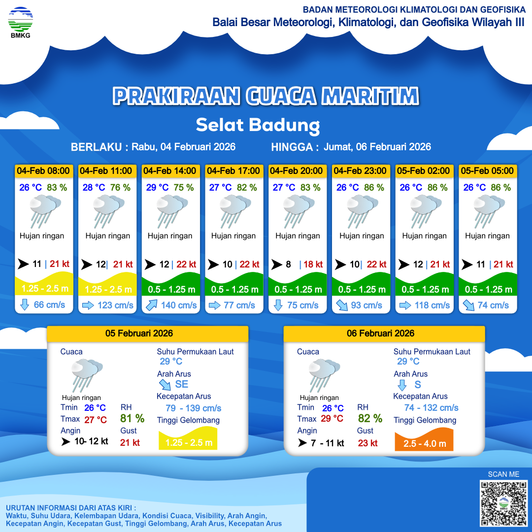 4 Feb 26, 18.00 8 jam kedepan | Barat 12 kt Gust Peningkatan kecepatan angin yang singkat dan tiba-tiba : 21 kt | 1 m Rendah | Timur 118.0 cm/s | 26 °C | 86 % | |
