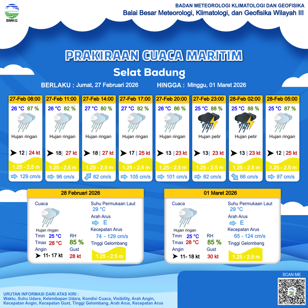 27 Feb 26, 23.00 3 jam kedepan | Hujan Ringan | Barat 11 kt Gust Peningkatan kecepatan angin yang singkat dan tiba-tiba : 26 kt | | | 25 °C | 90 % |