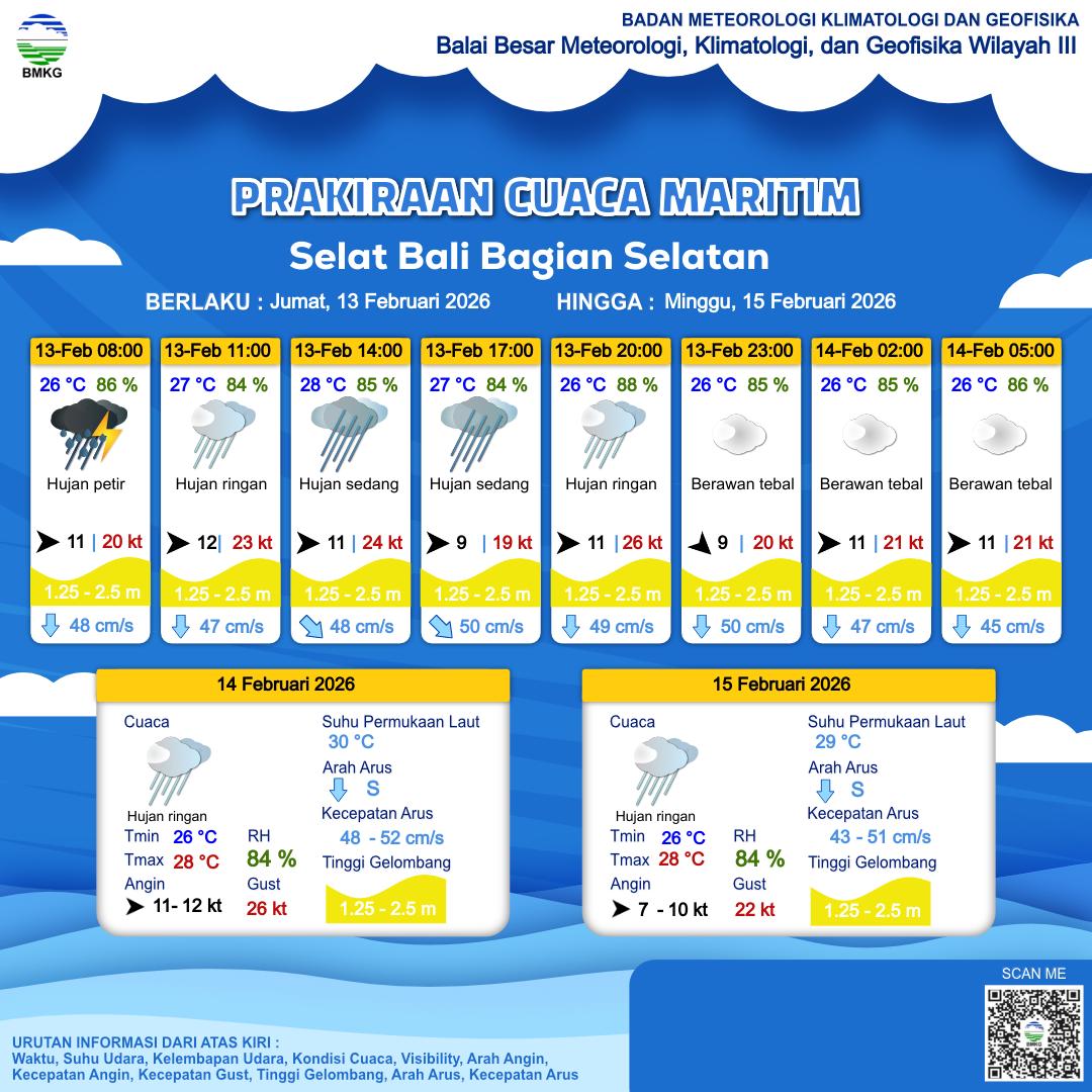 13 Feb 26, 17.00 2 jam kedepan | Barat 11 kt Gust Peningkatan kecepatan angin yang singkat dan tiba-tiba : 21 kt | 2 m Sedang | Selatan 48.0 cm/s | 26 °C | 85 % | |