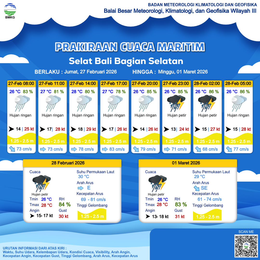 27 Feb 26, 23.00 3 jam kedepan | Hujan Ringan | Barat 15 kt Gust Peningkatan kecepatan angin yang singkat dan tiba-tiba : 30 kt | | | 26 °C | 86 % |