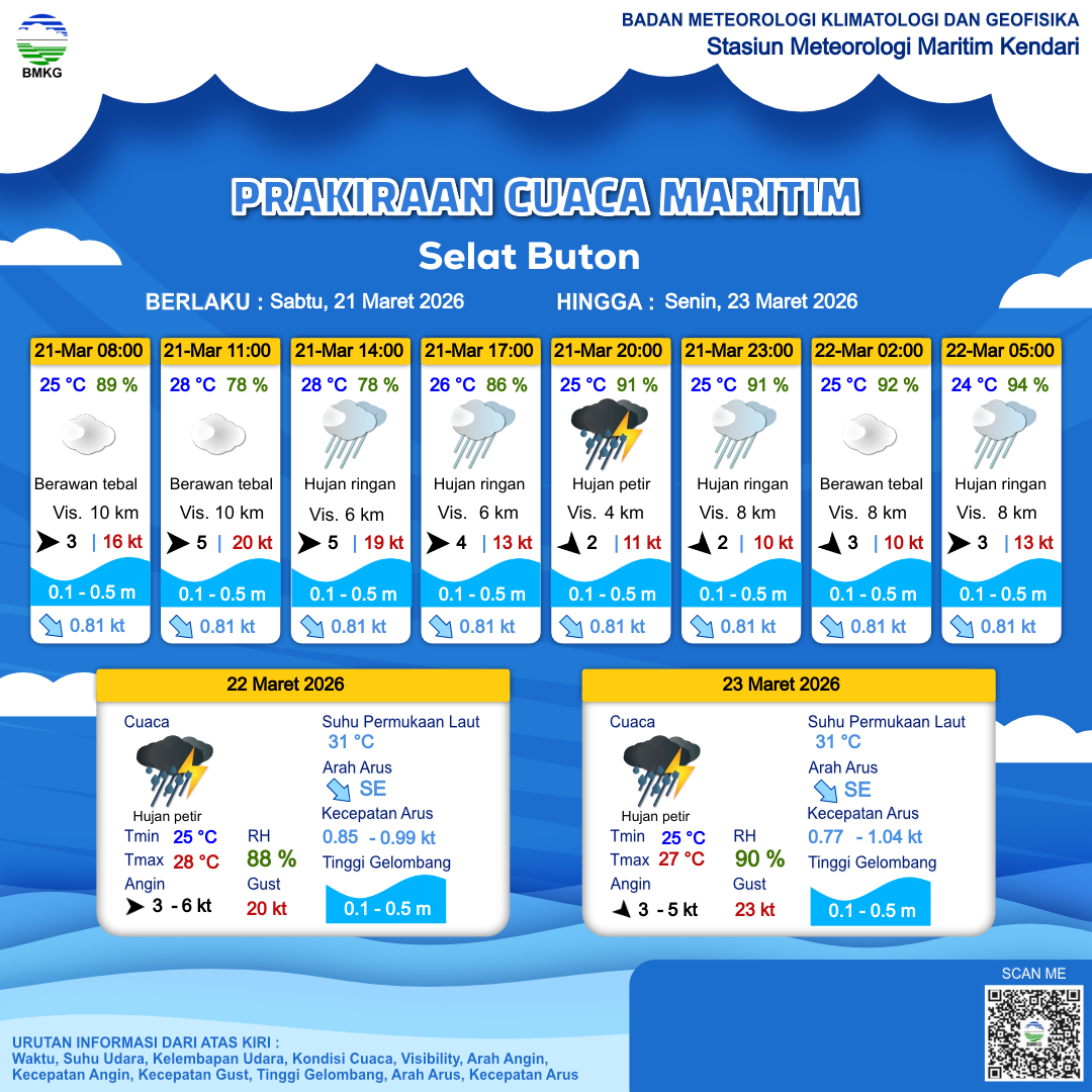 21 Mar 26, 09.00 4 jam kedepan | Barat 4 kt Gust Peningkatan kecepatan angin yang singkat dan tiba-tiba : 13 kt | 0.2 m Tenang | Selatan 1.0 Knots | 26 °C | 86 % | |
