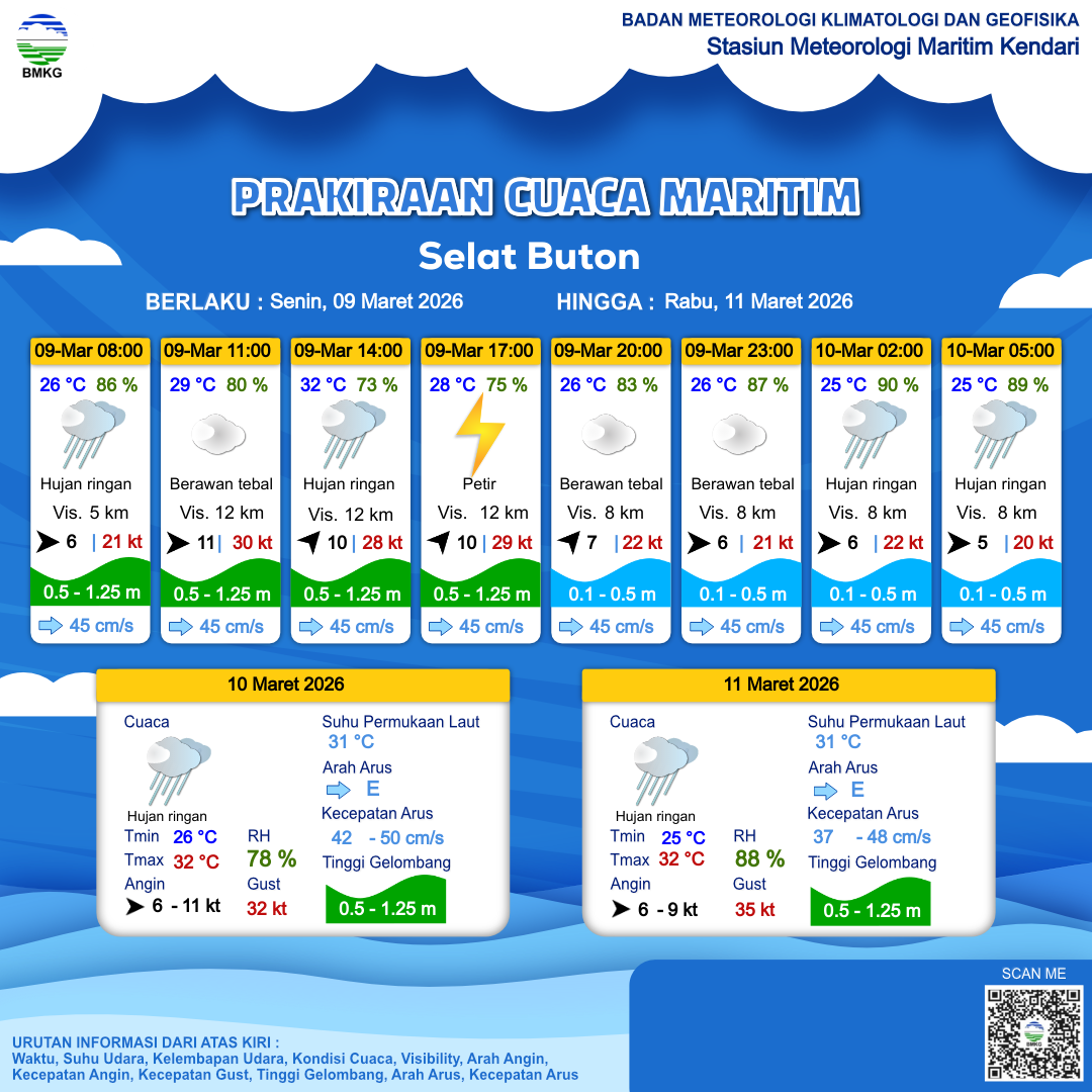 9 Mar 26, 21.00 4 jam kedepan | Hujan Ringan | Barat 5 kt Gust Peningkatan kecepatan angin yang singkat dan tiba-tiba : 20 kt | | | 25 °C | 89 % |