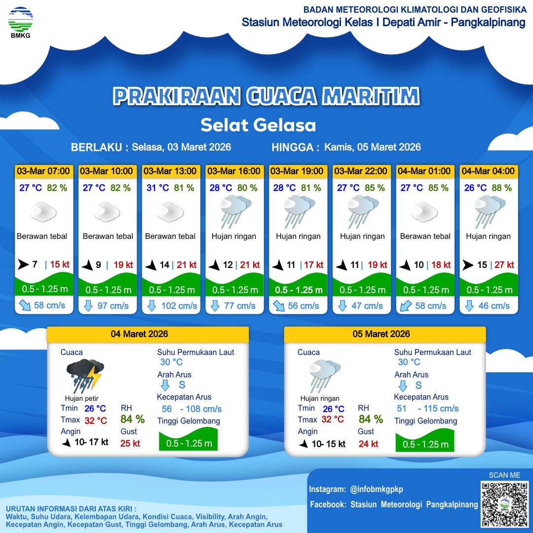 3 Mar 26, 22.00 20 jam kedepan | Barat 15 kt Gust Peningkatan kecepatan angin yang singkat dan tiba-tiba : 26 kt | 0.8 m Rendah | Selatan 41.0 cm/s | 26 °C | 87 % | |