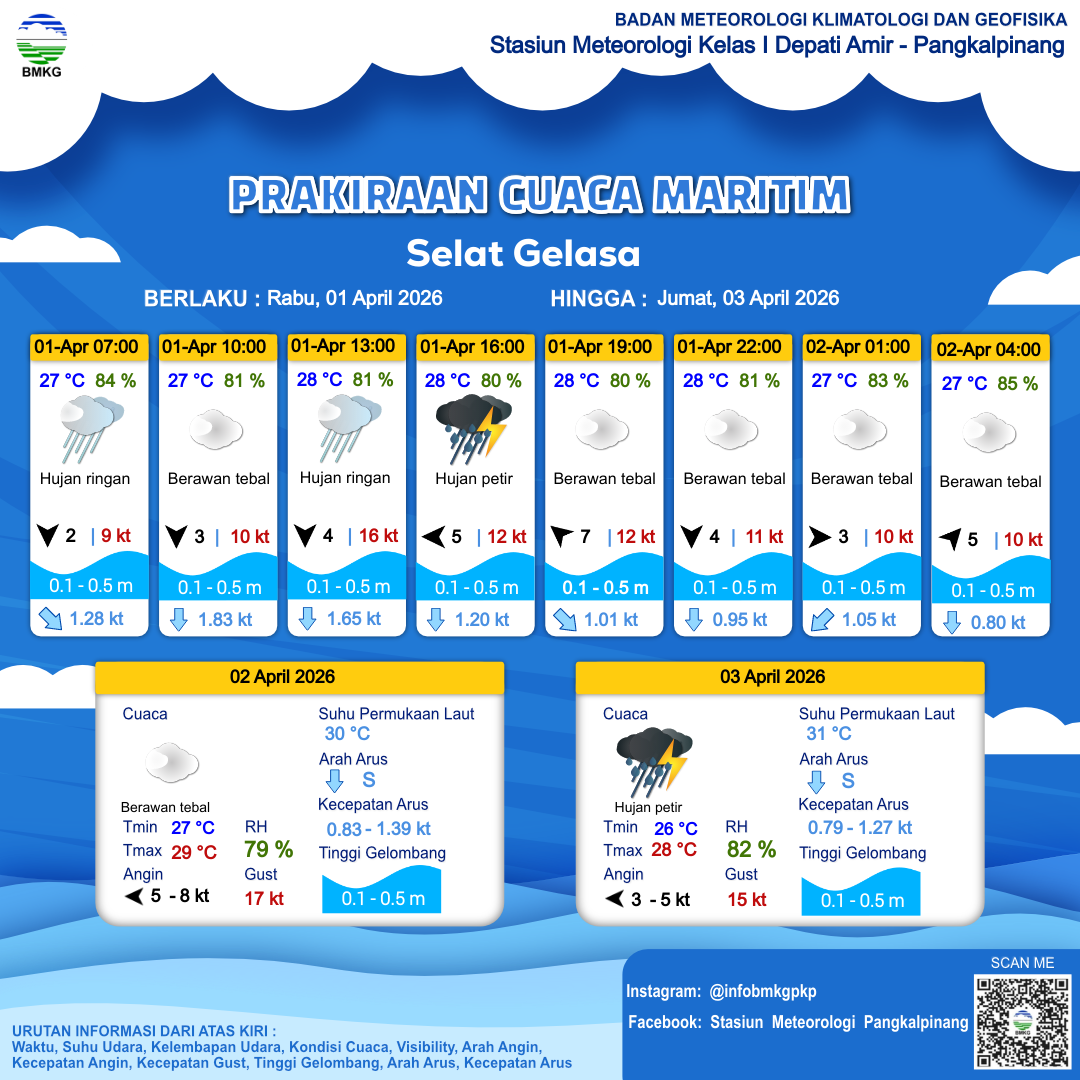 1 Apr 26, 23.00 5 jam kedepan | Berawan Tebal | Timur 5 kt Gust Peningkatan kecepatan angin yang singkat dan tiba-tiba : 10 kt | | | 27 °C | 84 % |
